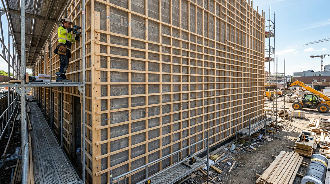 Préparation de l'ossature bois sur un mur extérieur pour accueillir le bardage en tuiles.